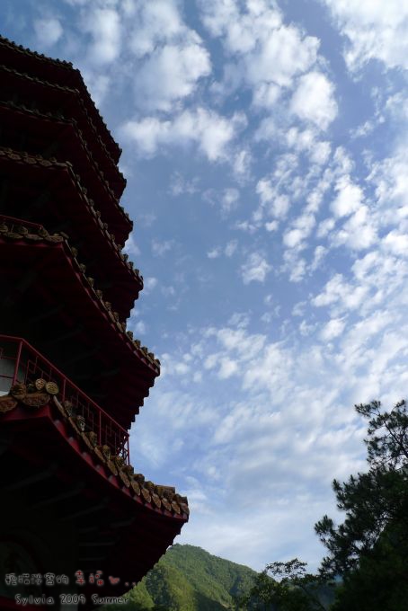 背景天空的澄澈搭配著顯眼的寶塔紅以及綠色的山景,所有的顏色顯的好純粹!